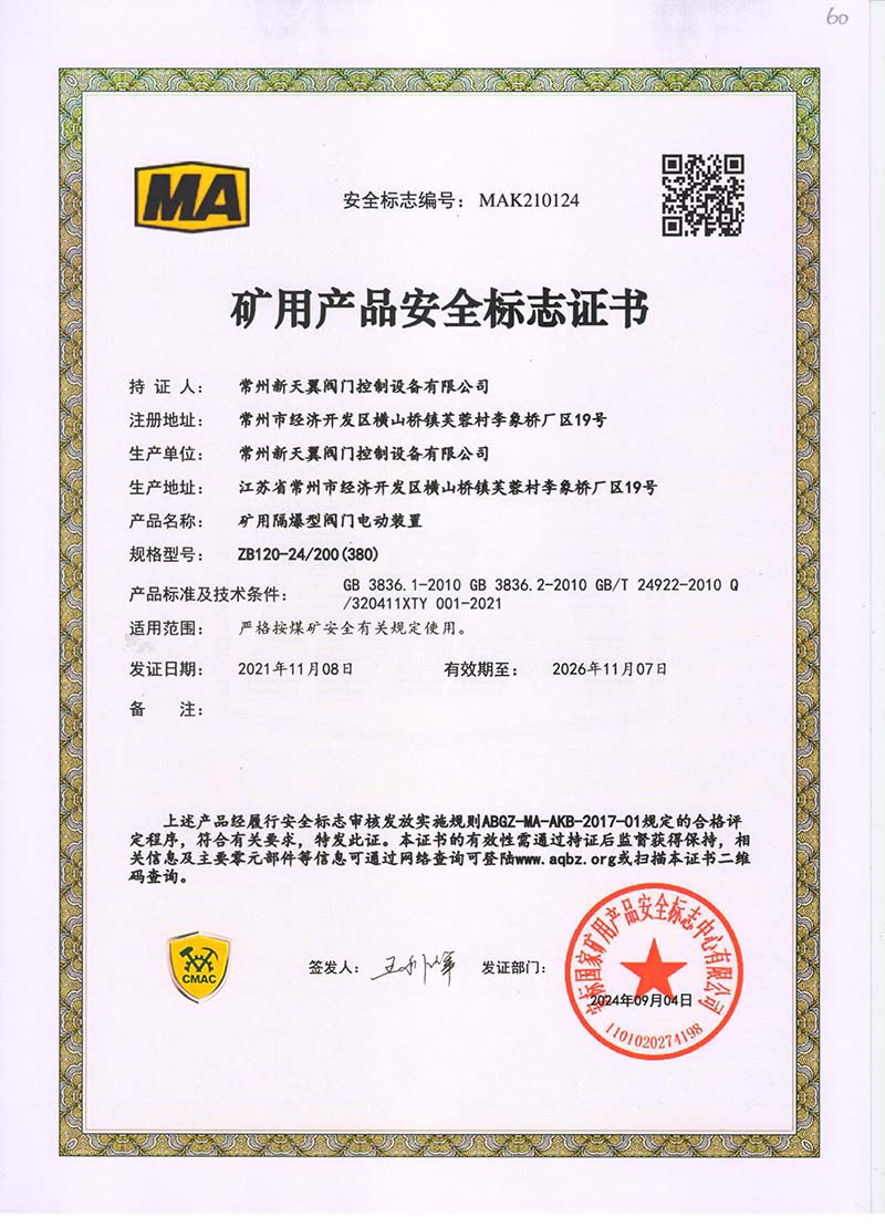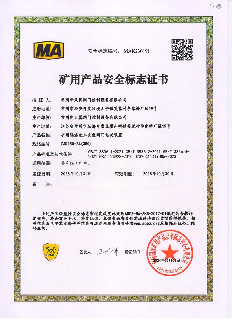 礦用產品安全標志證書ZJK120-24(380)