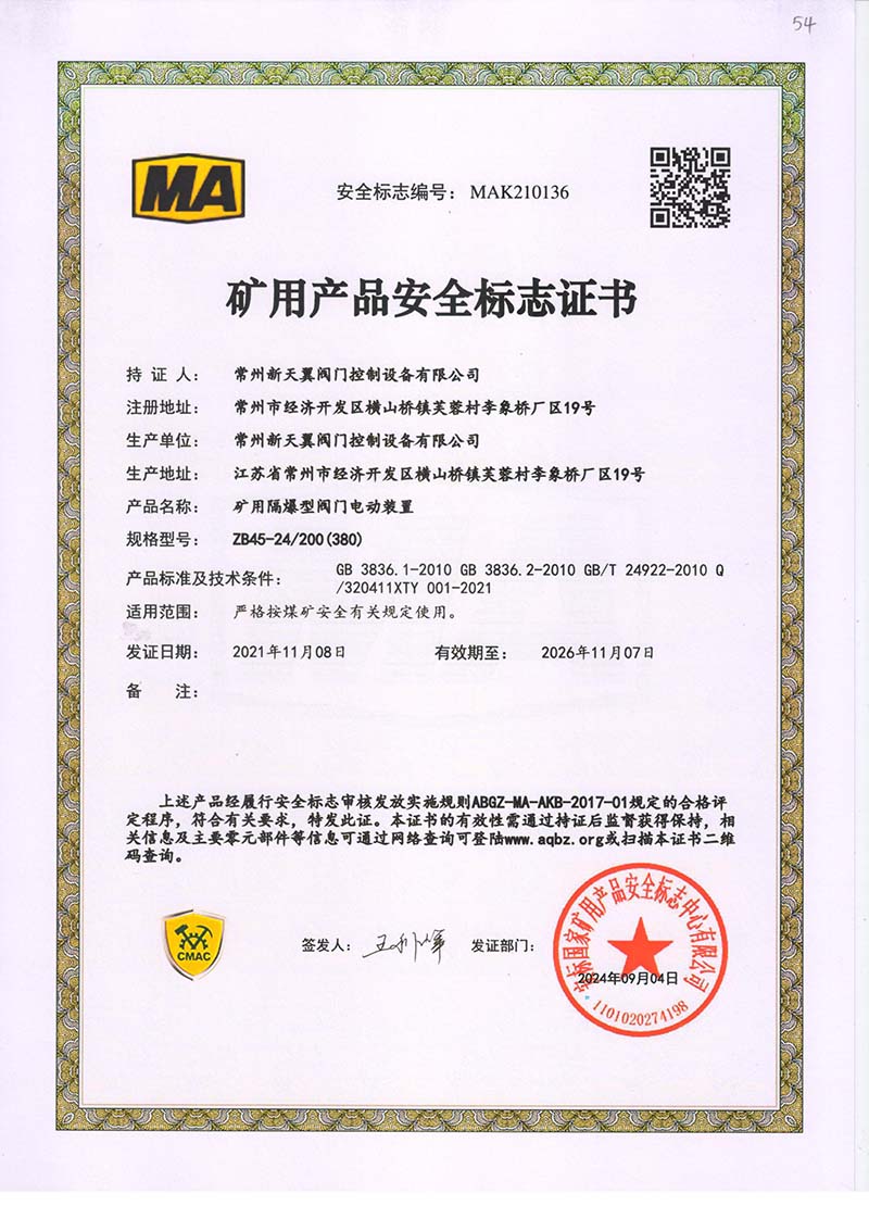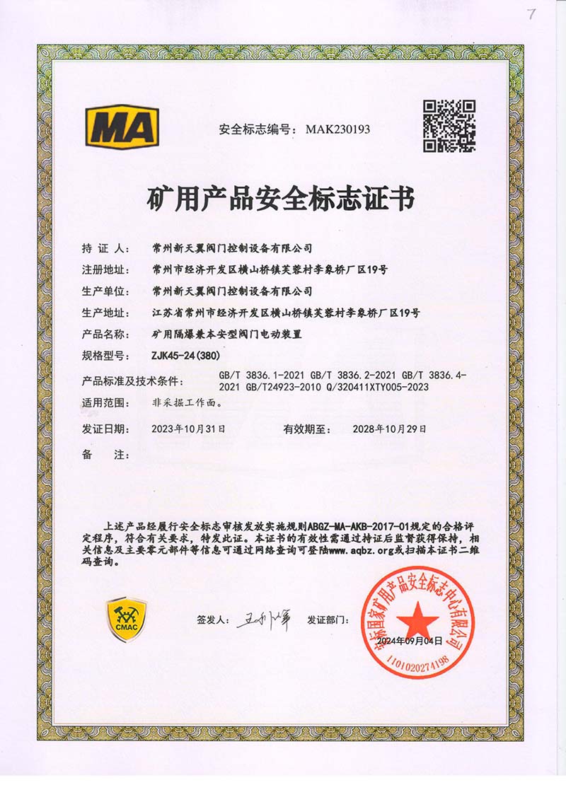礦用產品安全標志證書ZJK45-24(380)