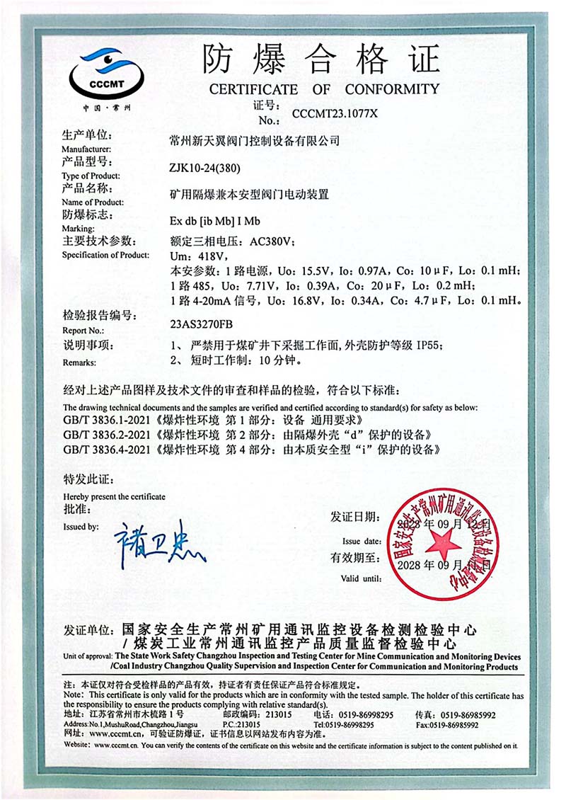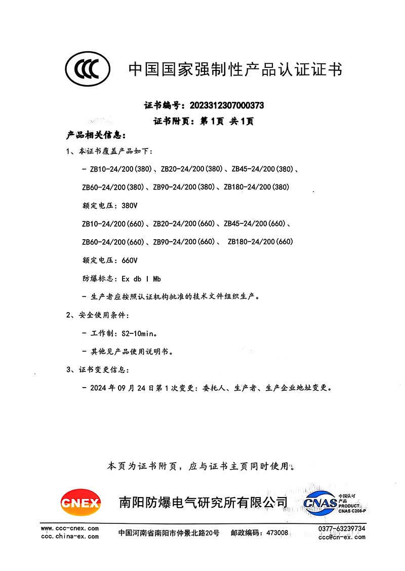 礦用隔爆ZB10-24中國國家強制性產品認證證書110.2