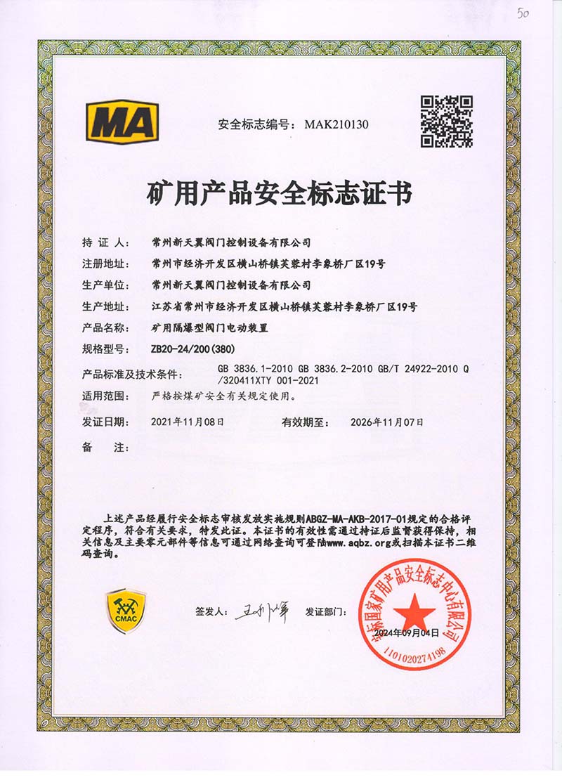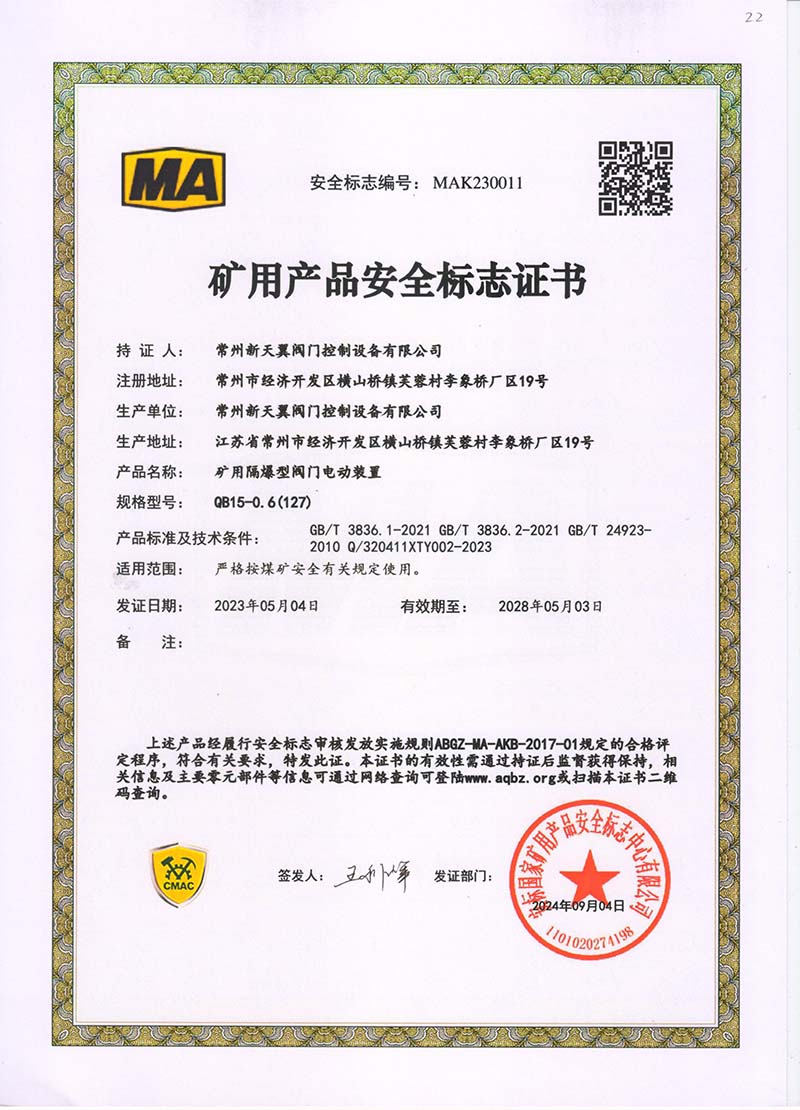 礦用產品安全標志證書QB20-1(380)