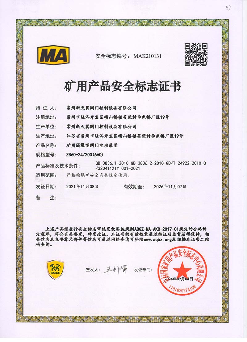 礦用產品安全標志證書ZB60-24 200(660)