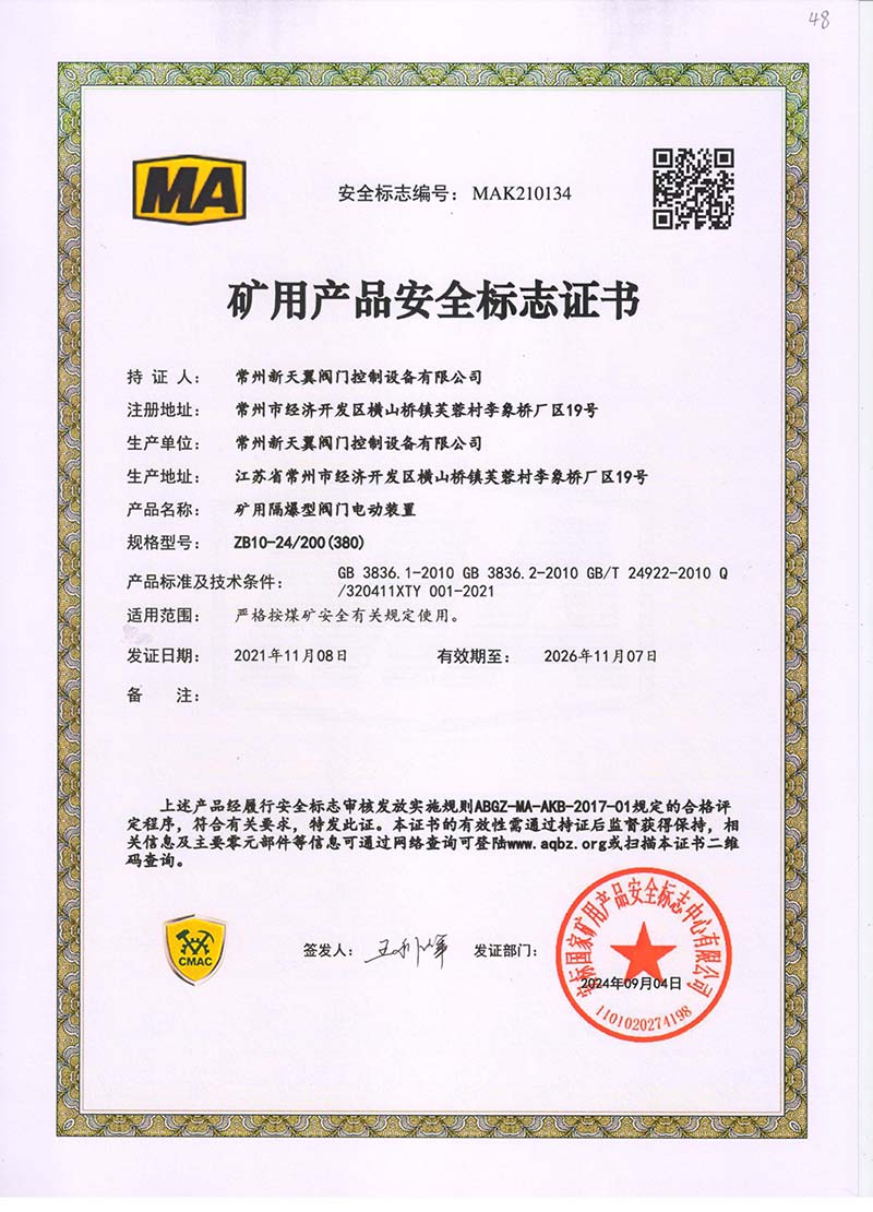 礦用隔爆ZB10-24中國國家強制性產品認證證書110.1