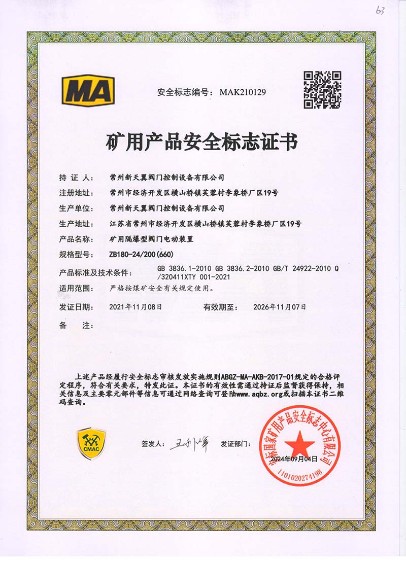 礦用產品安全標志證書ZB180-24 200(660)