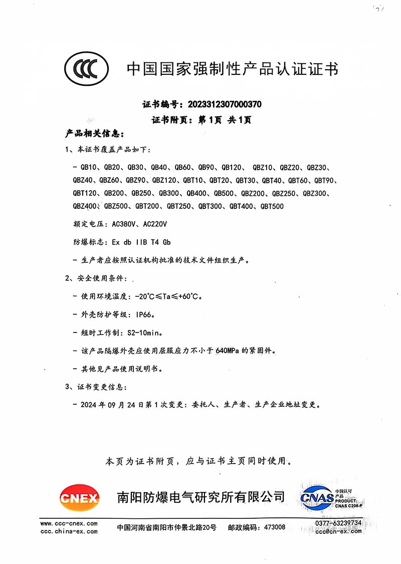 隔爆型QB QBZ QBT 220380中國國家強制性產品認證證書107.1