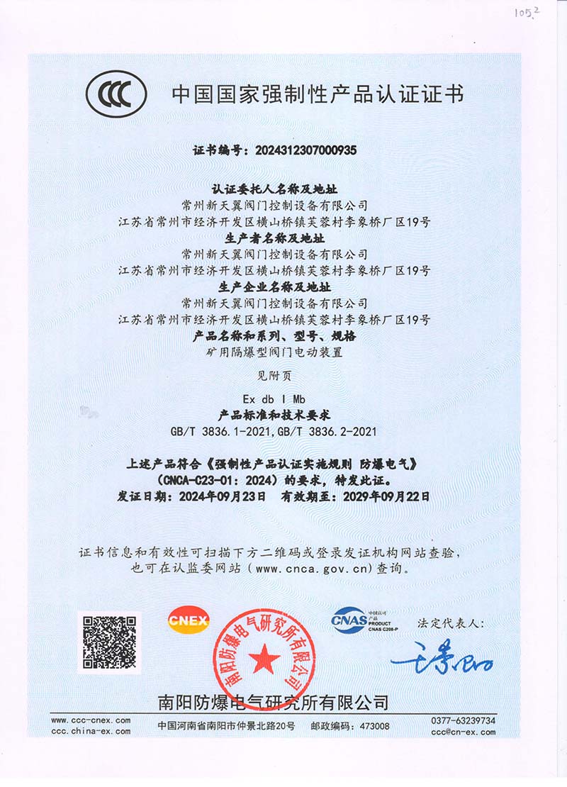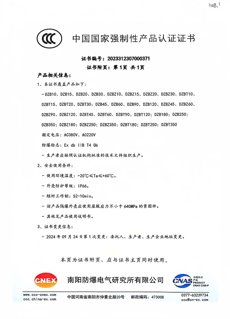 隔爆型DZB 中國國家強制性產品認證證書108.1